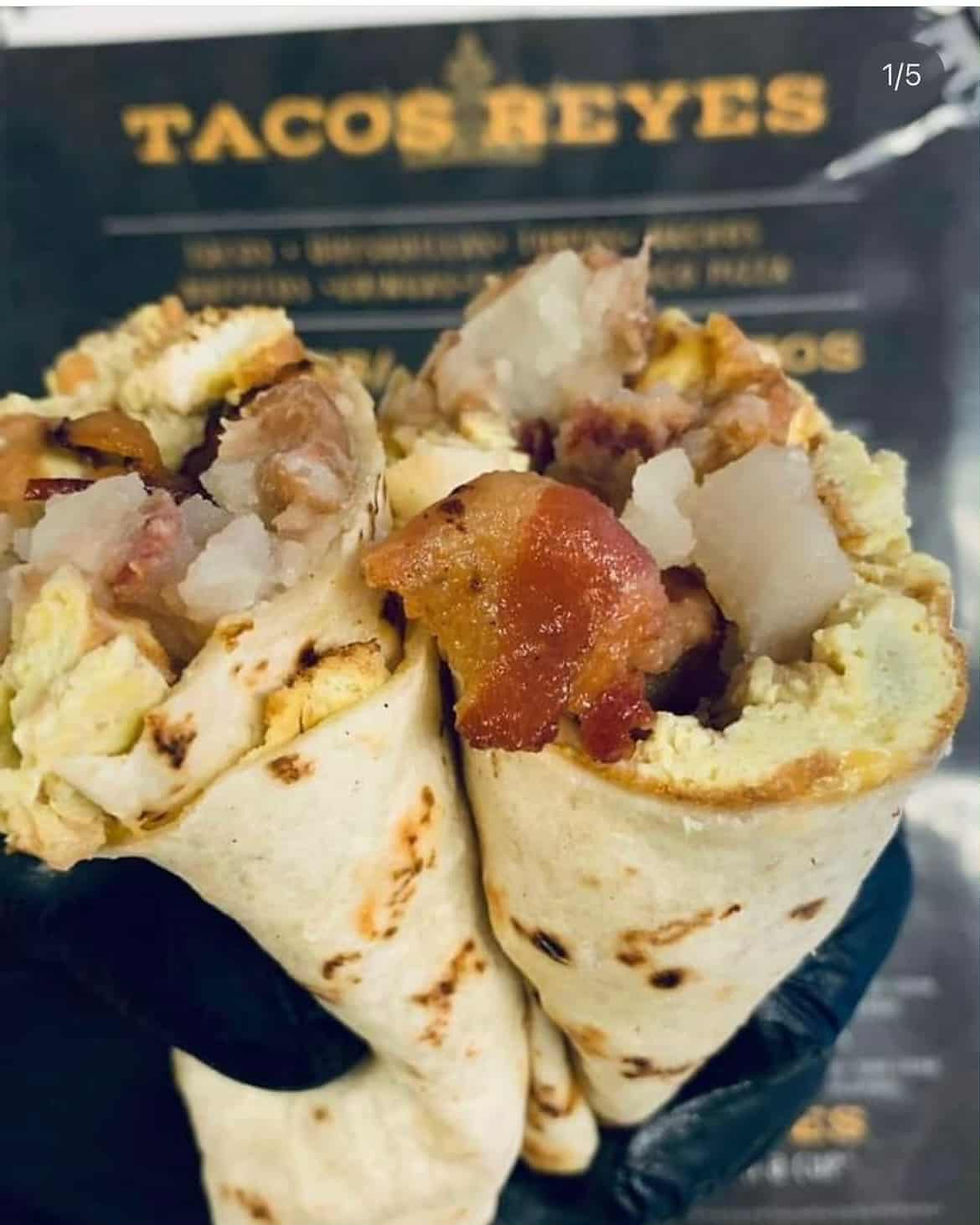 From fluffy breakfast tacos packed with eggs, cheese, and chorizo to hearty burritos layered with bacon, potatoes, and fresh avocado, Tacos Reyes turns every morning into a fiesta.